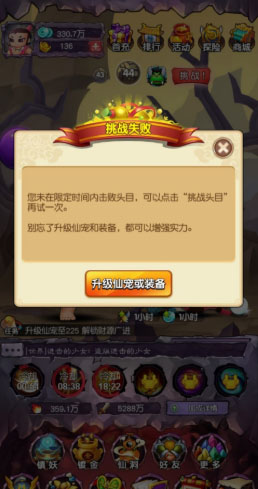 3、要是你在规定时间里没能把Boss捶死,那不好意思,系统会把你自动送回前一个关卡继续刷小怪,直到你觉得自己又行了,再手动点挑战Boss。