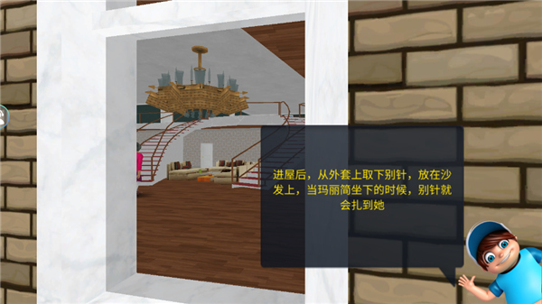 8、跟着地上的脚印提示走,任务是把图钉放到沙发上。