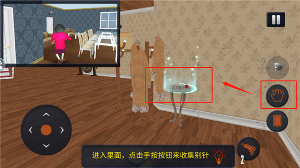 7、进到屋里后,点击那个手形按钮,就能捡起图钉了。